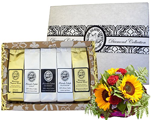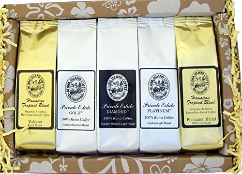 Title : Deluxe Pure Kona and Hawaiian Coffee Sampler Gift, Assortment of Five Coffee Roasts of Kona and Hawaiian Coffee, for Christmas, Mothers Day, Fathers Day, Corporate Gifts, All Occasions, Brews 60 Cups