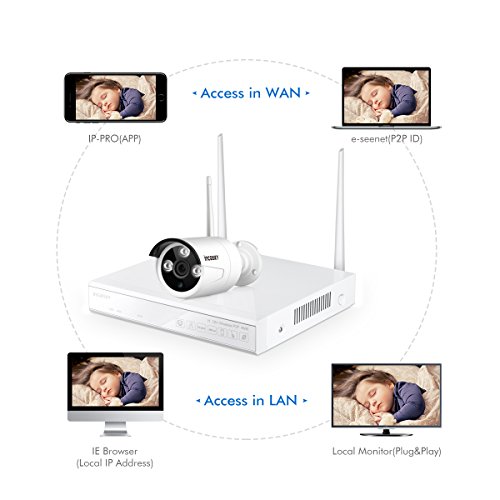 Easy Local/Remote Access: connect your devices and your DVR/NVR via Internet (WiFi) with P2P technology; live viewing remotely with IE browser, Windows CMS software and Android, iOS App; recording continuously to hard drive (1TB hard disk included), CMS or APP supported
