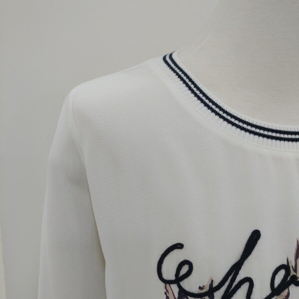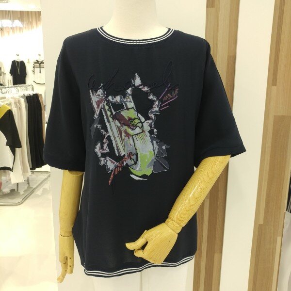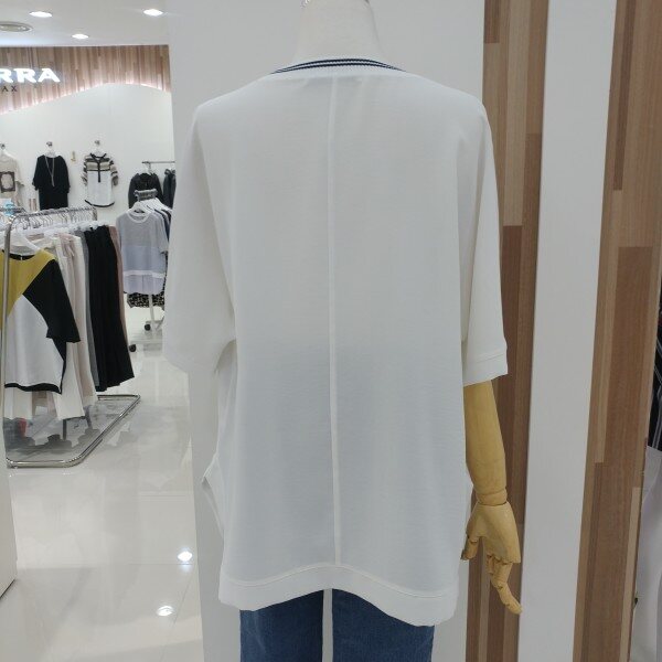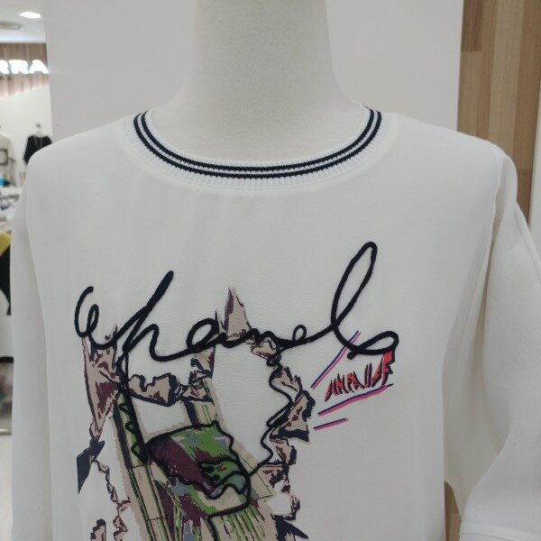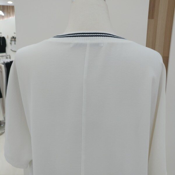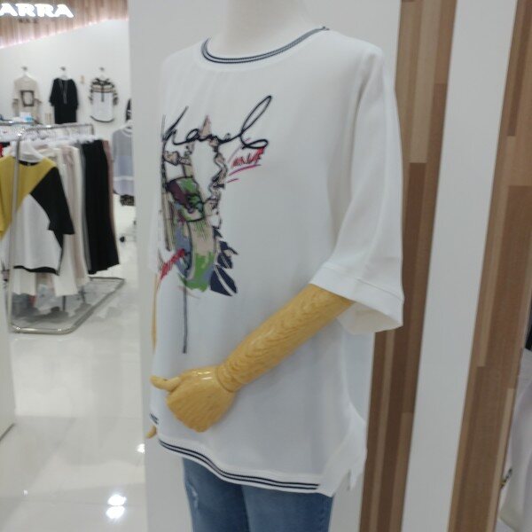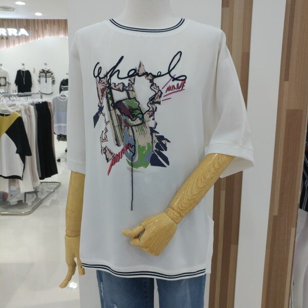 라운드네크라인과 하단에 쫀쫀한 시보리를 두고 전면의 프린트가 트리밍되어 세련되고 화사하며
