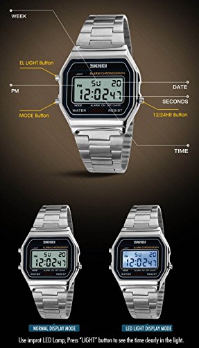 -. Feature : Stainless steel watch featuring link bracelet and rectangular dial window with digital display and stopwatch / Japan original quartz with clear , Alarm, Chronograph, Day/Date, Diver, ,EL Backlight / Brand new, fashion sporty digital design / Quartz movement / 3 ATM water resistance for convenience in your daily life