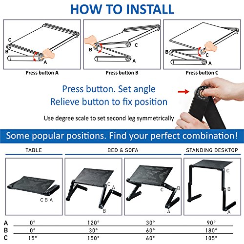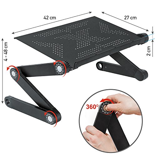 -. Feature : Very lightweight - 1 kg, made of high quality aluminum alloy / Adjustable height from 4 to 48 cm. Ideal for laptops up to 7-17" / Stopper to hold the laptop at any angle. Table size 27 X 42 cm / Flexible adjustment (over 7 positions): adjustable and versatile / Let your laptop be as a portable and convenient as it is meant to be! It helps to use the laptop for work and relaxtion (games, TV series, movies, browsing the internet, breakfast in bed). Use desk for you needs: choose a comfortable position and angle