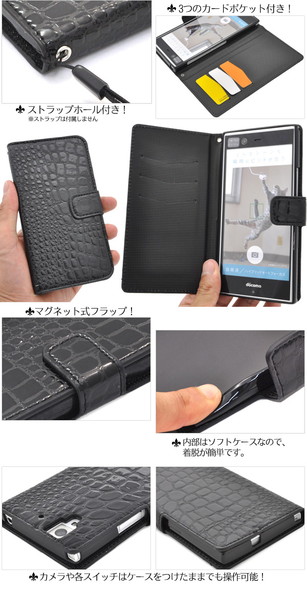 | 製品仕様 | | 対応機種 | arrows NX F-02H | | カラー | ホワイト/ブラック/ダークグリーン | | 素材 | 合皮(PUレザー)/TPU | | 注意 | ※本製品はマグネットを使用しておりますのでクレジットカードなどの磁気カードの収納は避け、カードの注意事項をよくご確認の上ご使用ください。 読み取り等ができなくなる恐れがあります。 ※本製品に収納された、カードのデータ等が喪失された場合におきましても、 当社では一切保証致しかねます。 ※長時間接触していたり、強い力で擦れるとスマートフォンに色移りする場合がございます。 ※本製品をスマートフォンに装着する際には本体や本製品に付着したゴミやホコリをよく取り除いてください。 ホコリ等がついたまま装着すると、スマートフォンに傷がつく恐れがあります。 ※ 本製品は強い衝撃からスマートフォンを保護することは出来ません。 |