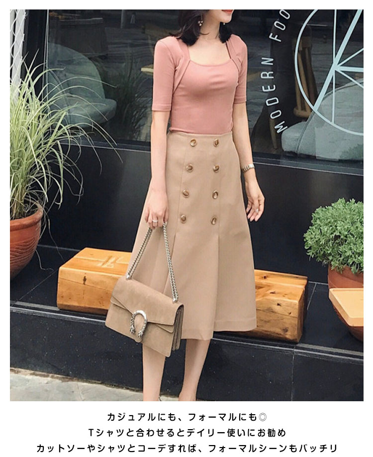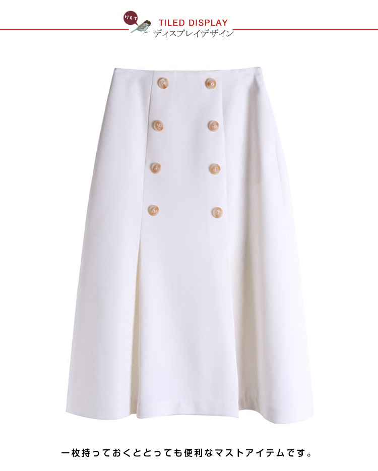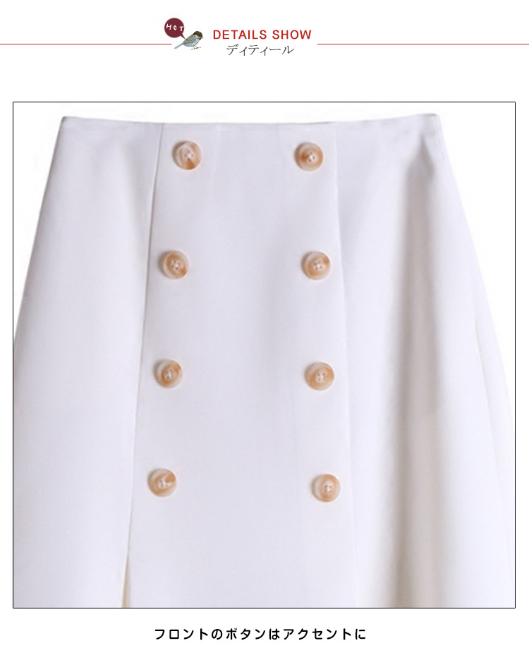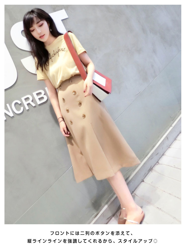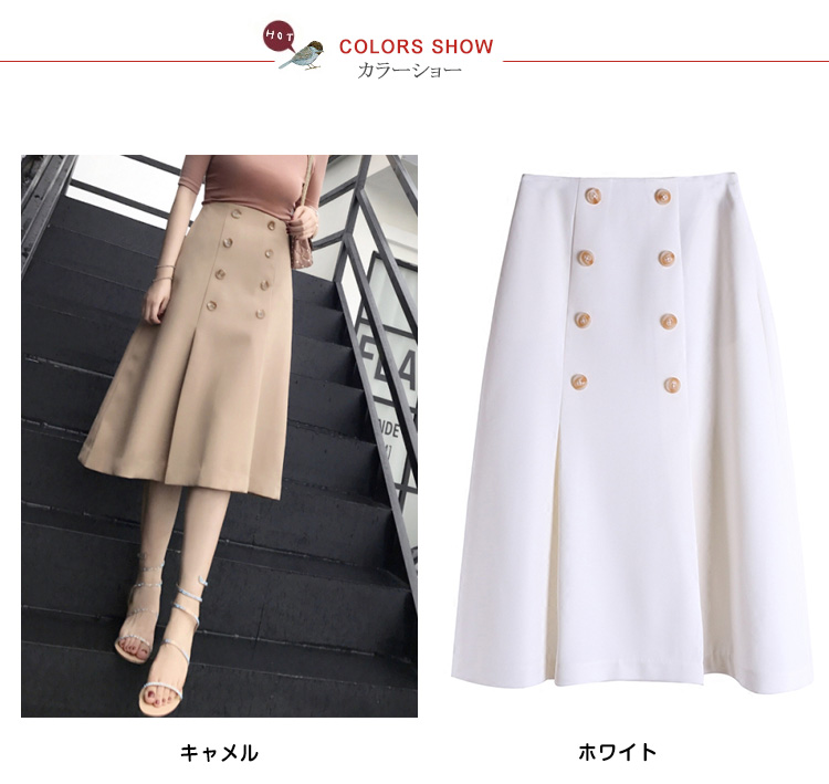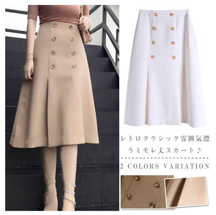| レトロクラシック雰囲気漂うミモレ丈スカート♪ウェストから裾に向かって広がるAラインシルエットが大人エレガントな着こなし◎フロントには二列のボタンを添えて、縦ラインラインを強調してくれるから、スタイルアップ◎カジュアルにも、フォーマルにも◎Tシャツと合わせるとデイリー使いにお勧めカットソーやシャツとコーデすれば、フォーマルシーンもバッチリ一枚持っておくととっても便利なマストアイテムです。 | |