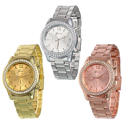-. Title : 3 PACK Geneva Silver Gold and Rose Gold Plated Classic Round CZ Ladies Boyfriend Watch
