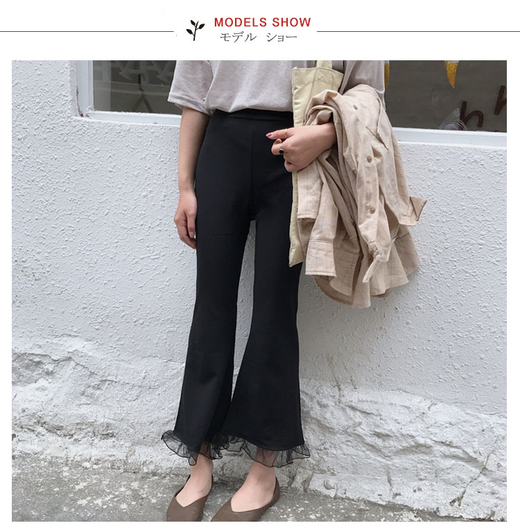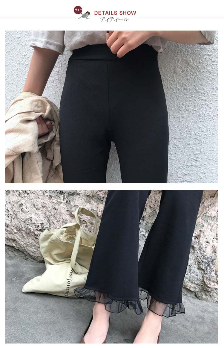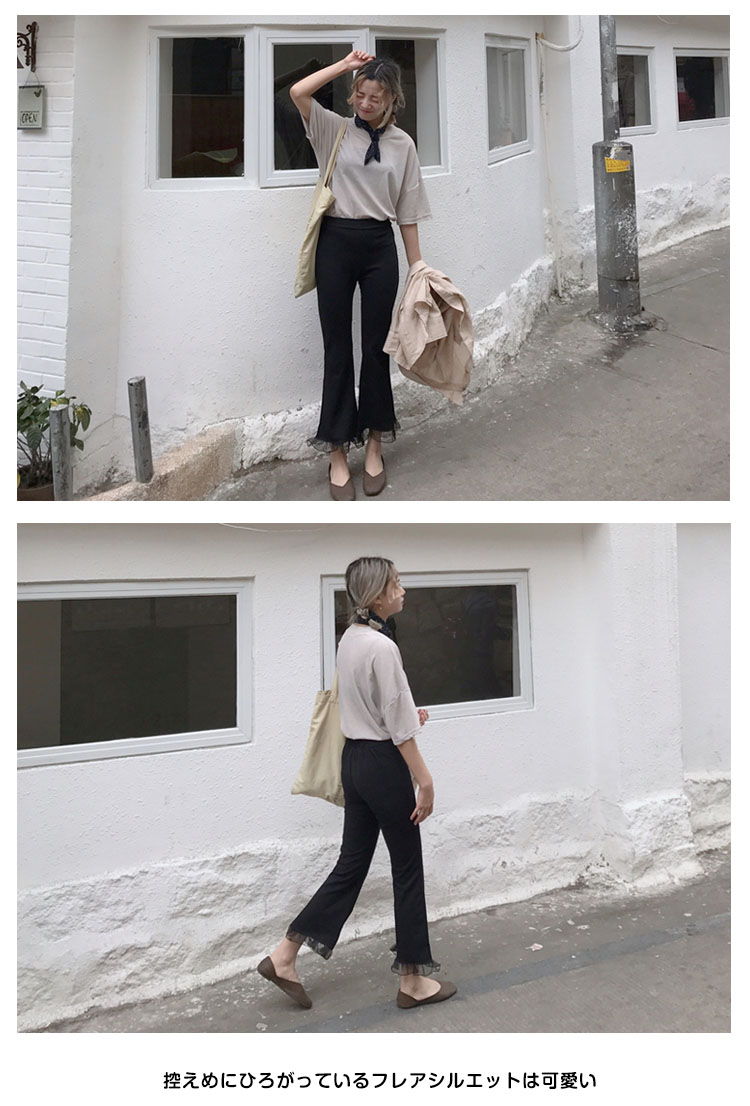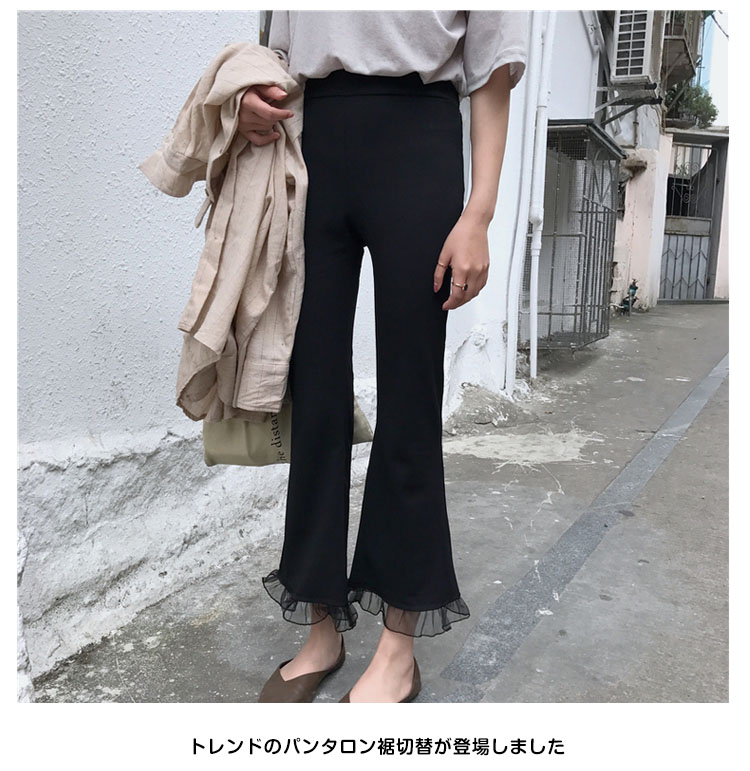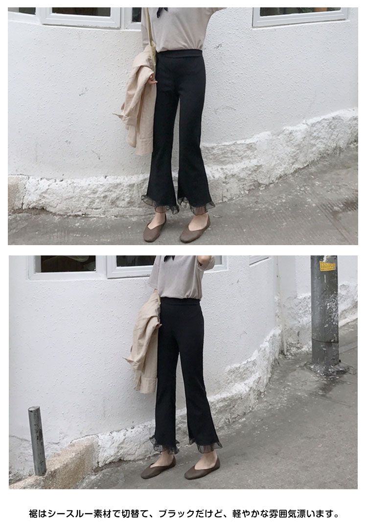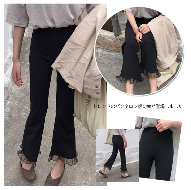 | トレンドのパンタロン裾切替が登場しました裾はシースルー素材で切替て、ブラックだけど、軽やかな雰囲気漂います。控えめにひろがっているフレアシルエットは可愛いいつものコーデと取り入れるだけで、旬のをGET!ディテール使いは、ちょっとお出かけにもお勧めです。 | |