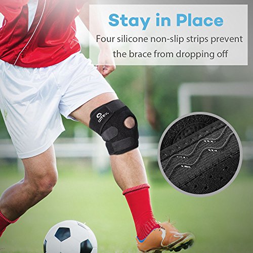 - Stay in Place: Silicone non-slip strips on the top and bottom prevent the knee brace from dropping off and provide patella compression while running, snowboarding, playing football and all competitive sports.