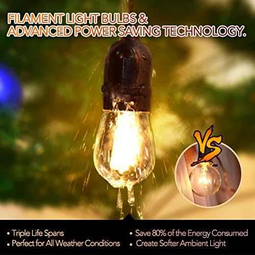 FILAMENT LIGHT BULBS & ADVANCED POWER SAVING TECHNOLOGY. Includes 15 FILAMENT LIGHT BULBS! Filaments has an abnormally high melting temperature which means much longer lifespan than incandescent bulb. In addition, our string lights with cutting-edge power saving technology that will consume much less power than other string lights ! It can reduce energy usage by over 95% by the experiment. At same time , the amber glow creates a soft, romantic light that we know you will love!