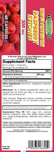 Studio : Total Nutrition Publisher : Total Nutrition Binding : Health and Beauty Product Description Raspberry Ketones helps support your weight loss goals in two ways, first, decreasing the absorption of ingested fats and secondly, increasing current body fat thermogensis. The recommended serving is 100 mgs twice daily.* As with any weight management program, Raspberry Ketones should be used in conjunction with proper nutrition and exercise. 0