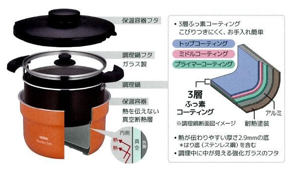 | 短時間火にかけた調理鍋を保温容器で丸ごと保温し、余熱で食材に火を通す「保温調理」ができる調理器具です。余熱でじっくり煮込むので、煮くずれさせず、素材本来の風味や旨みを生かしながら味をしみこませることができます。3層ふっ素コーティング加工の調理鍋を採用しているので、こびりつきにくく、お手入れも簡単♪ |
