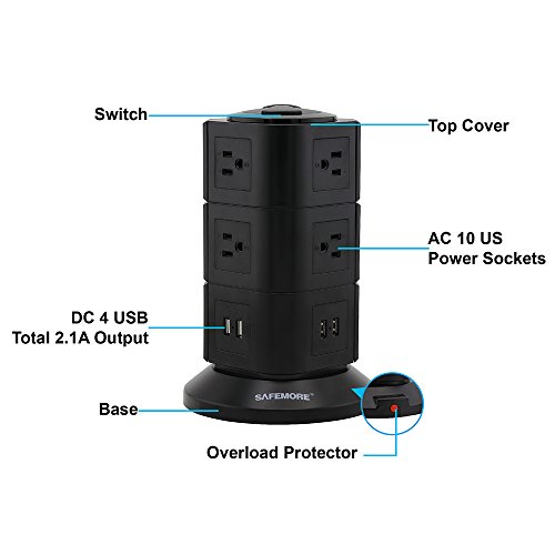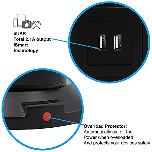 - MULTI CHARGING FUNCTION: 2.1A 4 USB Outlet + 10 Outlet Surge protector power strip , 4 USB ports with Smart technology, provide standard rate for your phones, tablets, usb light and fans, power banks and other devices for home & office