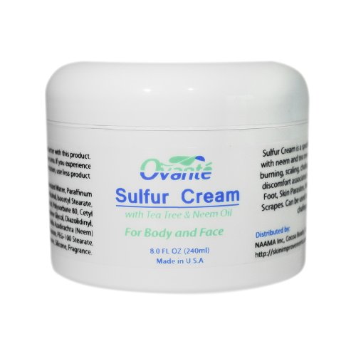 -. Feature : Sulfur cream Relieves itching, burning, scaling, chafing, redness , skin rashes, irritation and discomfort / Helps to treat Jock Itch, Ringworm, Athlete's Food, Minor Wounds, Sunburn, Scratches & Scrapes, Diabetic Ulcers, burns / Multi Purpose Specifically Formulated to promotes fast healing for hard-to-heal skin problems. / Comes in generous 8.0 oz ( 240 mL) jar, enough for treatment of face and body / Made With White Sulphur, Tea Tree and Neem Oil. Easy To Use.