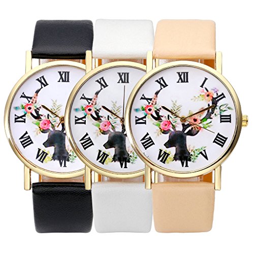 -. Title : Top Plaza Roman Numeral Scale Moose Head Dial Golden Alloy Case Leather Band Christmas Gift Analog Quartz Wrist Watch-Pack of 3