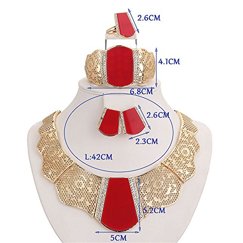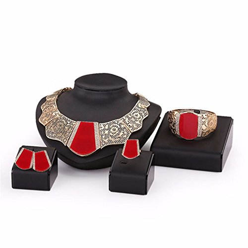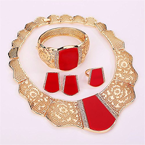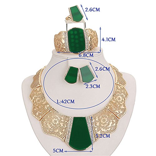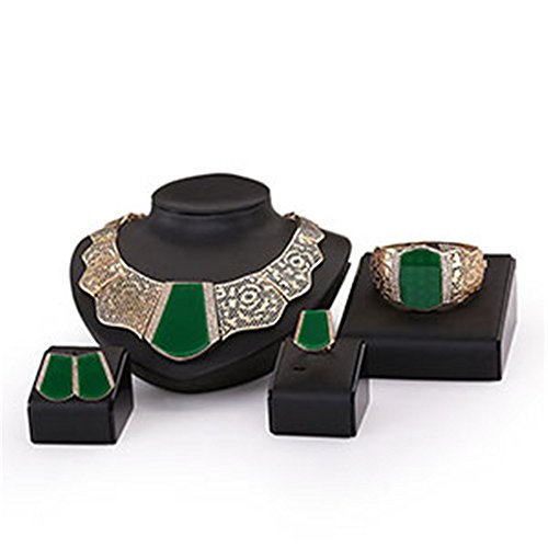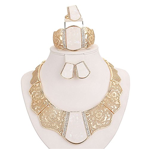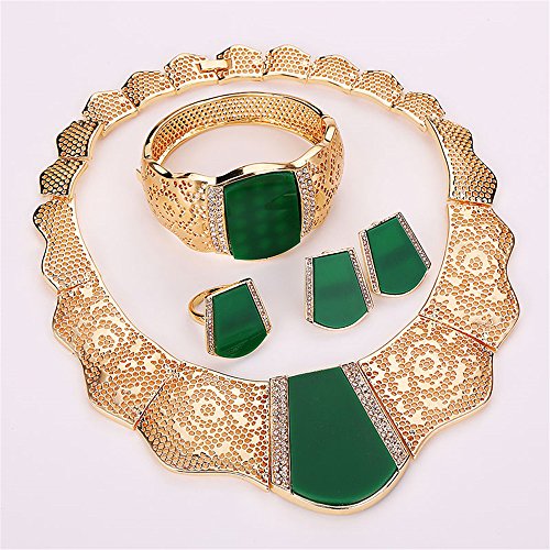-. Feature : Golden Gold Plated Special Jewelry Set / Size: As Picture / The surface of the jewelry is gold plated and the material is alloy. It will never fade and is not allergy for your skin. / This jewelry set is shinning, beautiful, luxury looking, so it is suitable many occasions, such as dinner party, birthday party and wedding. This set is an ideal gift for your girlfriend, fiancée, wife, mother or friend. It is also a good choice for engagement or wedding jewelry. / Including 1 necklace + 1 bangle + a pair of earrings + 1 ring in the jewelry set;