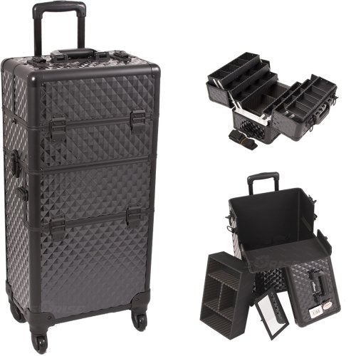 - Beautiful new black diamond pattern with black aluminum trimming Heat resistant exterior material keeps the case cool and protects your cosmetics Heavy duty handle for added comfort and grip