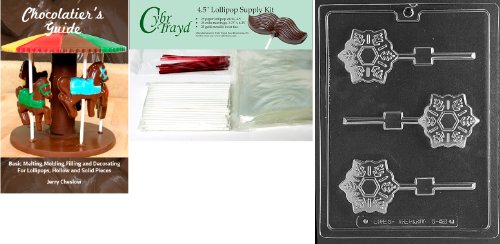 Cybrtrayd Snowflake Pop Chocolate Mold with Chocolatier's Bundle of 25 Lollipop Sticks, 25 Cello Bags, 25 Red Twist Ties and Chocolatier's Guide