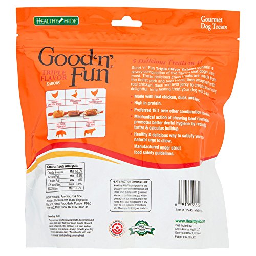 -. Binding : Misc. -. Brand : dog treats -. Color : Multicolor -. EAN : 0715658264925 -. Feature : Preferred 18:1 over other combination chews / Decadent, Gourmet dog treats are made with premium chicken, wholesome duck and hearty liver. / Wrapped with premium cuts of real meat that canines crave / These uniquely shaped treats provide long lasting entertainment -. Label : Kardin -. Manufacturer : Kardin -. Model : 82245H-H® -. MPN : 82245H-H® -. PackageQuantity : 1 -. PartNumber : 82245H-H® -. ProductGroup : Pet Products -. ProductTypeName : PET_SUPPLIES -. Publisher : Kardin -. Size : 12 oz -. Studio : Kardin -. Title : Healthy Hide Good n Fun Triple Flavor Kabobs Gourmet Dog Treats, 12 oz. Preferred 18:1 -. UPC : 715658264925