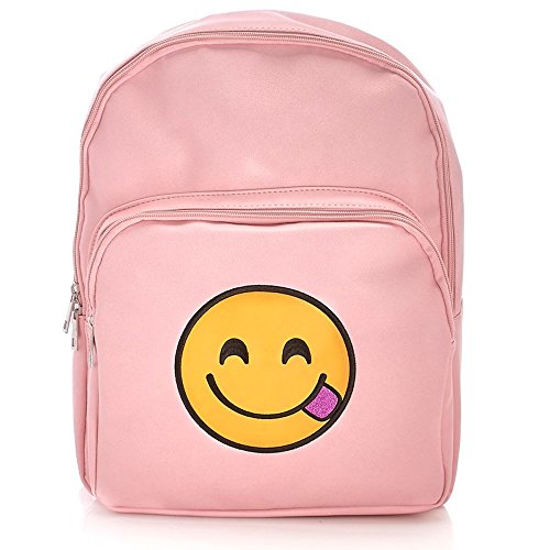 -. Feature : Cute smiley face emoji with pink glitter tongue on front compartment / Pink. Polyurethane (PU) faux leather / 1 main compartment with 1 interior pocket, 1 front compartment / 15.50"L x 12"W x 4"D. Adjustable straps with 21 inch drop length / Wipe clean. Imported