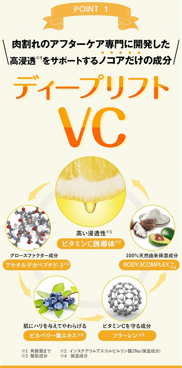 It is a body cream that penetrates deep into the skin of thick skin areas by adopting the new type vitamin C derivative "FANCOS C - IS" as a base ingredient.