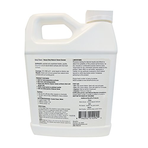 -. Binding : Kitchen -. Brand : Stone Pro -. EAN : 0773822575413 -. Feature : For polished and unpolished marble, granite, travertine and for use on all natural stone surfaces / Cleans and removes grease from natural stone surfaces and surrounding grout / Safe for all natural stone and tile surfaces / Powerful cleaner and degreaser. Safely cleans grout on polished marble. / Makes up to 8 gallons. 375-1500 sq. ft. per quart. -. IsAutographed : 0 -. IsMemorabilia : 0 -. Label : Stone Pro -. Manufacturer : Stone Pro -. Model : AX-AY-ABHI-59351 -. MPN : B00JWX3N14 -. NumberOfItems : 1 -. PackageQuantity : 1 -. PartNumber : B00JWX3N14 -. ProductGroup : Home -. ProductTypeName : HOME -. Publisher : Stone Pro -. Studio : Stone Pro -. Title : Stone Pro Deep Clean - Alkaline Heavy Duty Stone Cleaner Concentrate - 1 Quart -. UPC : 773822575413
