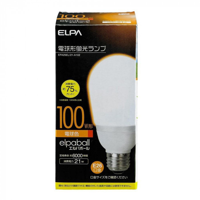 電球形蛍光ランプ、電球色です。 製造国:中国 商品サイズ:全長:135mm、外径65mm 重量:110g 仕様:口金:E26定格消費電力:21W定格入力電流:0.33A設計寿命:約6000時間全光束:1300lm光色:3波長形電球色交流電源:100V 50/60Hz共用屋内用 ※サプライヤー直送品 ご注文後3~4営業日後の出荷となります【商品名】ELPA(エルパ) 電球形蛍光ランプ 3波長形電球色 100W形 EFA25EL/21-A102