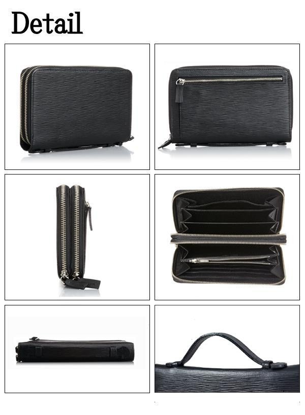 傷が目立ちにくい型押しレザーを使用したクラッチバッグ兼長財布です。2層に分かれたメインコンパートメント内には多数のポケットや仕切り、計16枚分のカード入れを備え、機能的で収納力も抜群。大きく開くラウンド型のファスナーは、中身を確認しやすく、取り出しもスムーズ。ちょっとした外出ならこれ一つで十分です。 |