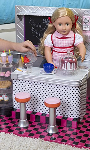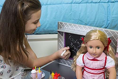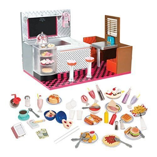 Meet the gals after school or run it yourself, the Our Generation Bite To Eat Retro Diner is always in fashion, just like your 18 inch doll. The coolest addition to your dollhouse, this retro diner has everything you need for hours of fun. All Our Generation dolls, clothes, and accessories are made with safe, carefully-chosen, high-quality material. They can be collected and saved and recycled the old fashioned way (by being passed on), are shipped in friendly packaging, and are easy to clean and maintain. At Our Generation we are dedicated to a new, multifaceted generation of girls who are playing hockey, getting involved in charities, dressing fashion-forward, and still finding time to, you know, be kids. This realistic and completely playable diner is fully compatible with most 18 inch dolls, including American Girl dolls and accessories. It includes 1 diner, 2 stools, 2 knives, 2 forks, 2 spoons, 2 bowls, 2 glasses, 1 drink pitcher, 2 4 dishes, 1 cake tray with 1 lid, 1 napkin holder, 1 salt shaker, 1 pepper shaker, 1 sugar shaker, 1 vinegar bottle, 1 mustard and 1 ketchup bottle, 1 hamburger with bun top and bottom, meat patty, pickles and lettuce, 1 grilled cheese sandwich, 1 hot dog with bun, 1 smoked meat dish, 1 spaghetti dish, 1 fish sticks dish, 1 basket of French fries, 1 bowl of tomato soup, 2 bacon strips, 1 serving of sausages, 1 serving of fried eggs, 9 cupcakes, 6 heart cookies, 9 doughnuts, 1 ice cream sundae, 1 ice cream cup, 1 cake with one removable piece, 1 pie with one removable piece, 1 pie tray, 1 pancake dish, 1 brownie ice cream dish, 2 soda bottles, 1 milkshake, 2 juice drinks, 1 coffee pot, 1 cup of coffee and 1 saucer, 1 pencil, 1 order pad, 6 paper bills, 3 coins, and 1 piece of chalk. For ages 3 and up. Please note: doll sold separately.Feature