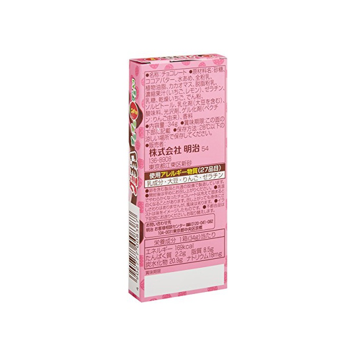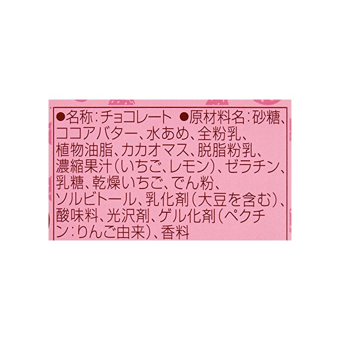 원재료:설탕,코코아 버터,물엿,전분유,식물성 기름지,카카오 마스,탈지분유,농축 과즙(딸기,레몬)고, 젤라틴,유당,건조 딸기,나오지 않겠 분,솔《비토루》,유화 제(대두를 포함한다)고, 신맛료,광택 제,겔화 제(백 친:사과 유래)고, 향료