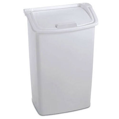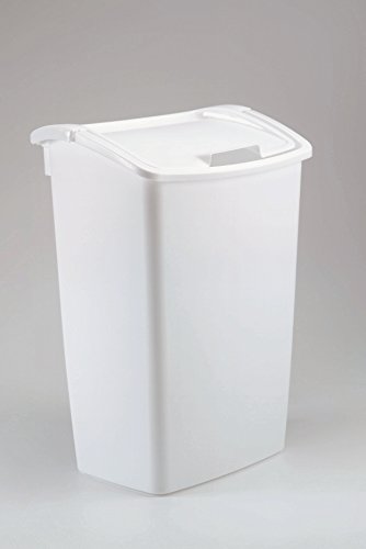 [Product Information]- 45 Qt white plastic kitchen wastebasket, dual action self closing, lid swings down or lifts up, uses 13 gallon plastic liners