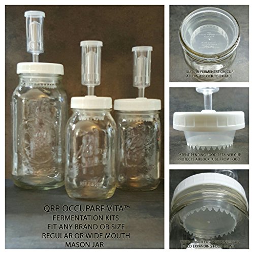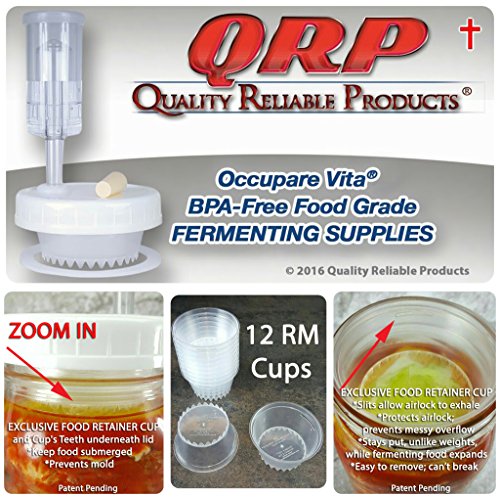 Studio : Quality Reliable Products Publisher : Quality Reliable Products Binding : Kitchen Product Description Please refer to QRP Basic Fermentation Instructions when using THE PATENT PENDING QRP OCCUPARE VITA FOOD FERMENTATION RETAINER CUP, which situates on the mouth of any brand standard Mason jar. Other systems tell us to fill the Mason jar no more than ¾ full; not so with QRP Cups. QRP Cups have numerous benefits over COSTLY GLASS OR CERAMIC FERMENTATION WEIGHTS. The QRP Food Retainer Cup 1) stays put in place and can't shift, 2) holds the fermenting food submerged in the brine, 3) leaves practically no air space in the jar, 4) allows for a full Mason jar food fermentation, 5) prevents any chance of mold, and 6) protects any airlock device from becoming stopped up which could become a potential explosion. And who wants glass or ceramic chipping or breaking into the food? Glass or ceramic fermentation weights are also known to burst for no apparent reason during the fermentation process causing waste of the entire batch. ⓒ 2016 Quality Reliable Products, All Rights Reserved. 0