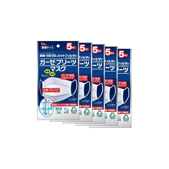 ●양면 거즈5 층타입 ●플리츠 가공에 의해 구(기초)원인로 공간을 만들어 깨끗하게! ●거즈(면)가 보습 하고, 목구멍이나 피부에 상냥하다! ●세탁해 반복해 쓸만합니다.유익이다「5매입×5 개세트」.