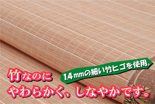 孟宗竹の表面付近の目がぎっしり詰まった部分のみを使用しました。表面部分は汚れにくく、耐久性に優れ、熱伝導率が高いため、ひんやり感も抜群です。1.4mmの細ヒゴを使用しています。竹を細ヒゴにする事で硬いイメージのある竹がやわらかく、しなやかになります。裏には不織布を貼っていますので、フローリングでのご使用に適しています。竹は他の木材と比べると、格段に成長が早く(3~5年で成竹)、持続的生産が可能な環境に優しいサスティナブルな素材です。