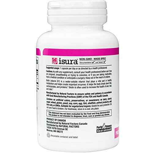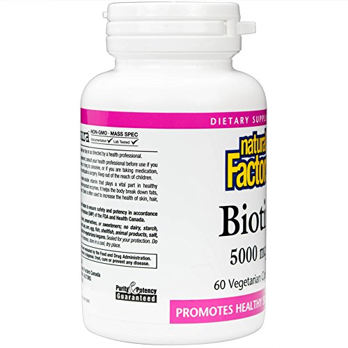 Studio : Natural Factors Publisher : Natural Factors Binding : Health and Beauty Product Description Biotin 1000 mcg by Natural Factors 90 VegCap Biotin 1000 mcg 90 VegCap Biotin (vitamin B7) is a water-soluble vitamin that plays a vital part in healthy metabolism and helps create important enzymes. It helps the body break down fats carbohydrates and proteins. Biotin is often used to increase the health of skin hair and nails. Supplement Facts Amount Per Serving Daily Value Biotin 1000 mcg 333 Calcium (dicalcium phosphate) 25 mg 3 Percent Daily Values are based on a 2 000 calorie diet Other Ingredients Microcrystalline cellulose vegetarian capsule (carbohydrate gum (cellulose) purified water magnesium stearate(vegetable grade) Warnings Keep out of reach of children. As with all dietary supplements consult your healthcare professional before use. See product label for more information. 0