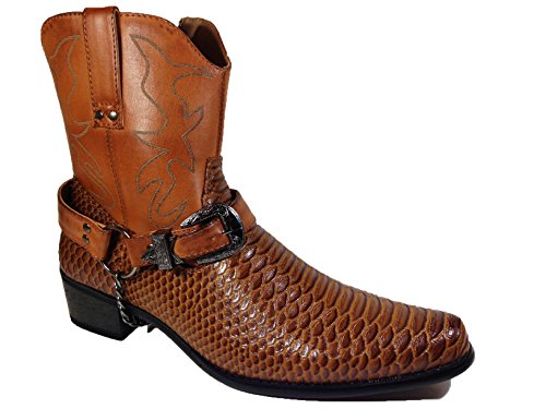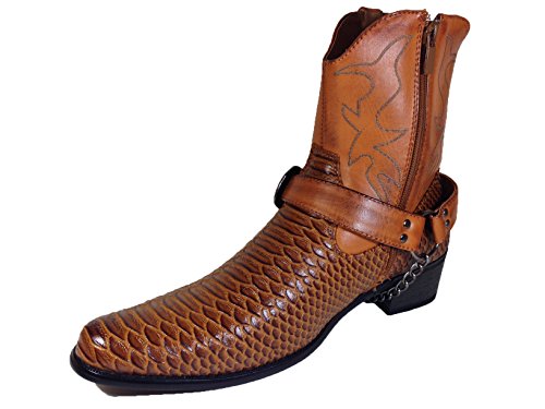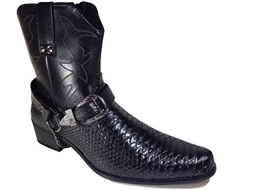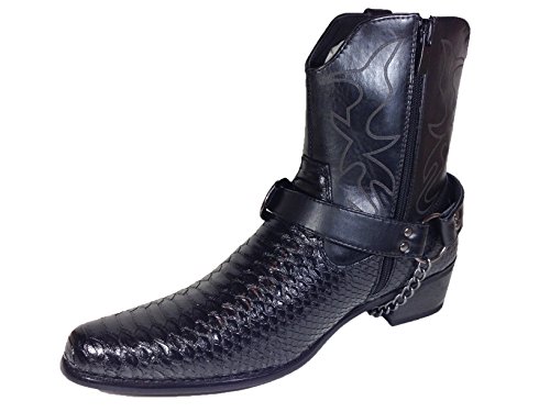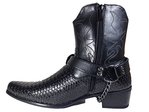 -. Binding : Apparel -. Brand : Alberto Fellini -. Color : Black -. Department : mens -. Feature : Synthetic / All Men Made Material / Removable and Adjustable Stud Ankle Buckle Detailing / Easy On/Off Full Side Zipper / Heel: 1.5" Approximate -. ProductGroup : Shoes -. ProductTypeName : SHOES -. Title : Men's Crocodile Prints Western Cowboy Boots with Side Zipper, Belt Buckle and Metal Chain