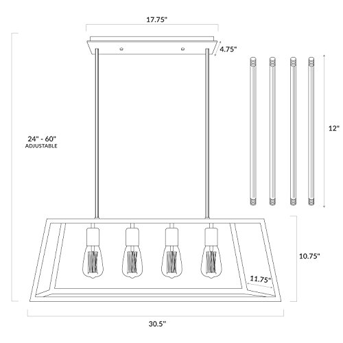 PRODUCT DIMENSIONS: 11.75"W x 30.5"L x 10.75"H • Wire/Stem: 48"H (4x 12" rods on each side ) • Ceiling Canopy: 17.75"L x 4.75"W. this light is ideal for foyers, kitchens, dining rooms, living rooms, and bathrooms.