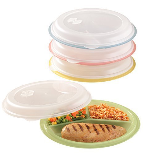 Studio : Miles Kimball Publisher : Miles Kimball Product Description Divided plates and food storage containers with snapon lids let you make and freeze healthy TVdinner style meals, then just pop 'em in the microwave. Then, divided plates with lids make it easy to store leftovers back in the fridge without using multiple containers. Set of 4 trisection sturdy plastic plates in translucent colors lets you see what's inside. Lids feature vent holes and easylift tabs. Microwave, freezer, and dishwasher safe. The round plates are 9 1/4" dia. and 1" deep. When the covers are on, it increases the height of this item to 2"H. 0
