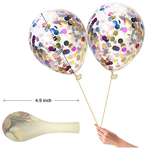 Balloon inflated diameter: 15 inches/38cm Balloon color: semi-transparent Confetti diameter: 1.5 cm/ 0.6 inch Confetti color: multicolor
