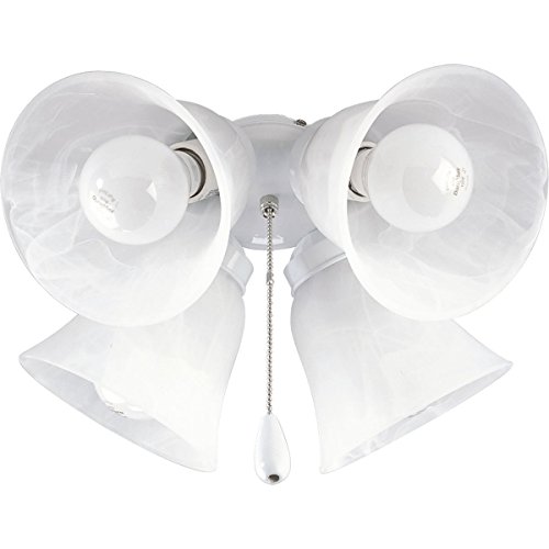 Progress Lighting has over 5,000 lighting fixtures offered in our catalog, the largest single source for residential and commercial lighting. General Four alabaster glass shades with spring clip attachment - 5-3/8'' dia. x 4-7/8''tall Pull chain on brushed nickel (-09) is chrome with a maple fob, white (-30)finish is chrome with a white fob, polished brass (-10) is polished brass chain with a medium oak fob, and on the rest are antique brass with a medium oak fob. Utilizes 4 - 60w medium based lamp and includes 4 - 13w medium base CFL(non-dimmable) Meets requirements of Energy Policy Act of 2005 (EPACT)Mounting For use on P2500 , P2501 or P2524,P2525, and P2502 (indoor only) fans only. Electrical Four ceramic medium based sockets Quick connect wiring to fan Prewired Shade Included: TRUE.