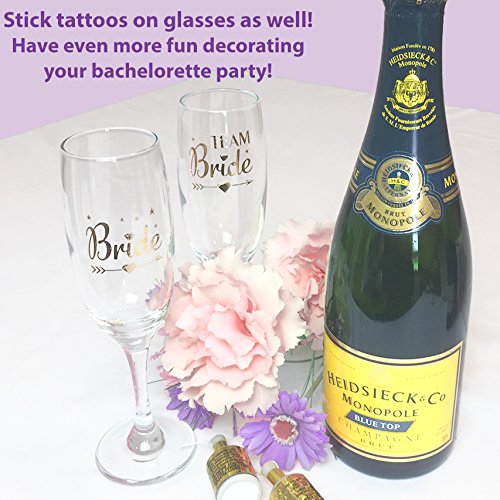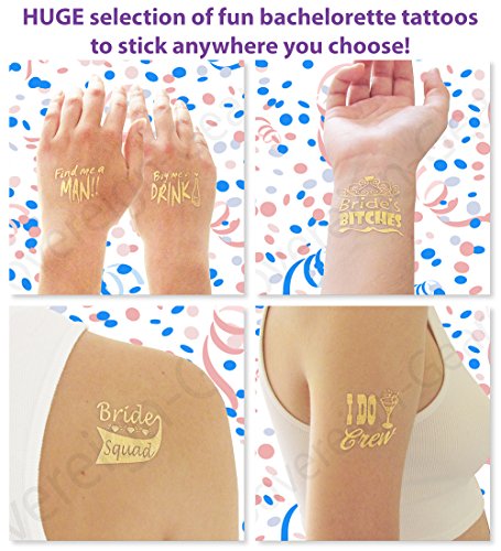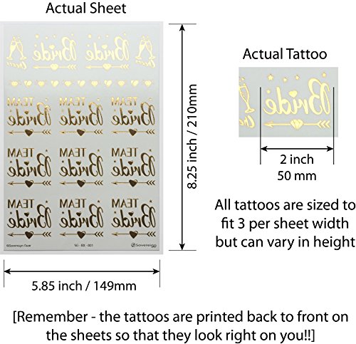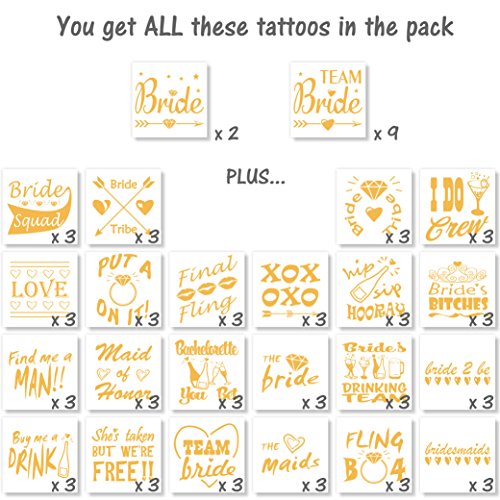 - EXCLUSIVE COPYRIGHT DESIGNS - fun temporary tattoos for girls, women and fun loving guys and men, to add bling to your bridal celebrations and wedding party. Beautiful gold transfers party props which add extra glamor to your fun filled bridal bash