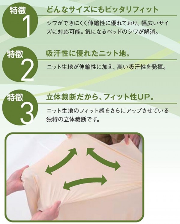 伸び率約160%のストレッチ素材で、マットレスに強くフィットし、シワができにくいシーツです。