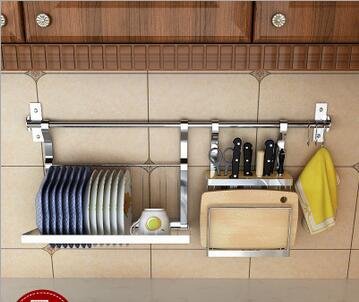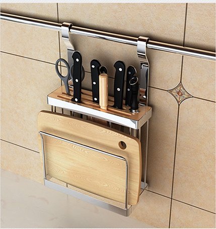 Wall Mounted Kitchen Cookware Organizer with 31-inch Stainless Steel Bar Chopping Board Holder Knife Block Dish rack