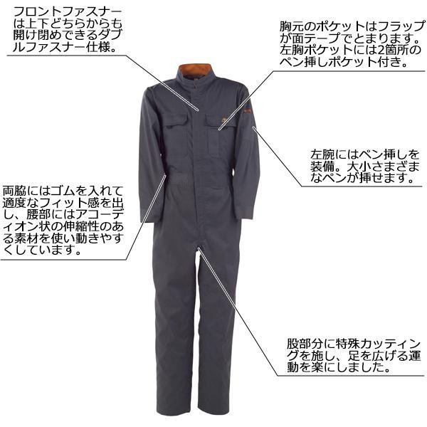 | 肩部分のアクションプリーツや腰部分のアコーディオン状の伸縮素材や股部分の特殊カッティングなど、つなぎ服を着て作業する際の「突っ張り感」を解消する工夫を盛り込みました。フロントファスナーは、上下どちらからも開閉自在のダブルファスナーを採用しています。全身つなぎは一枚で全身を覆ってくれるので、屈んだ時に背中が出るのを気にしないで済むため、作業にはとても向いています。 |