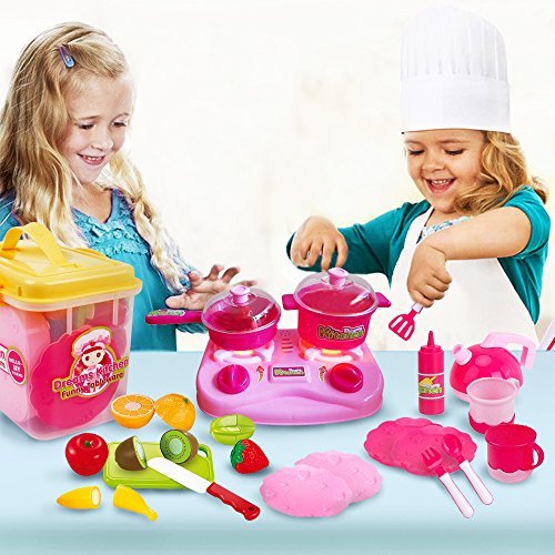 -. Feature : ✔ A YOUNG CHEF'S DREAM COME TRUE - Kids can play slicing the play fruits & cooking a delicious fruit soup, and preparing them for the family in the Beautiful dishes. This girls kitchen playset includes the essentials for cooking and serving play fruits. The Cooktop can make cooking sounds and Lights with two AA Batteries! / ✔ TREAT YOUR CHILD TO THE BEST - The FUNERICA Childrens play food fruits and dishes are made out of high quality plastic in bright colors and everything included in this girls kitchen toys set were extensively tested to ensure that they meet the safety standards of toys and are 100% safe for kids. / ✔ KIDS LOVE A CARRYING TOY BOX - A Mini Durable carrying box with dual closures holds all the kitchen toys and kid dish set neatly and closes on two sides to prevent spills. / ✔ COMPACT SIZE AND EASY CLEANUP - Everything of this kitchen playsets for girls stores inside the carrying box when playtime is done! A compact kitchen toys set for girls that is sure to inspire hours of imaginative play! / ✔ 'FUNERICA' SATISFACTION GUARANTEE - We have designed the mini cooking set with great detail, The Kids Play Food and Dishes is made of High quality and Bright colors. However, if you are unhappy with the toy for any reason, we offer a 30-day hassle free refund with Free Return Shipping! (with free pickup option if needed). Just shoot us an Email!