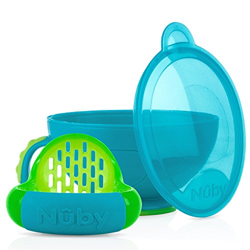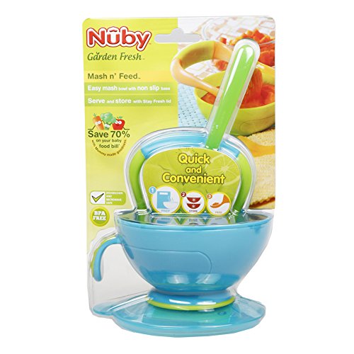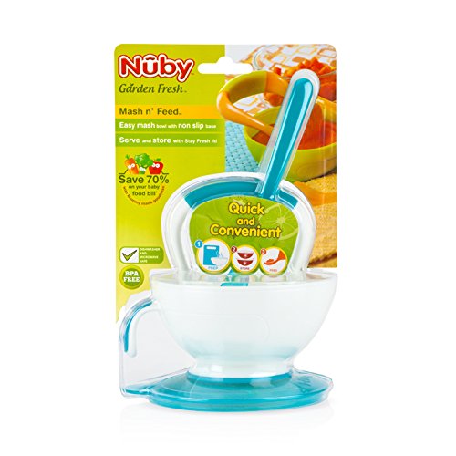 Nuby's new garden fresh mash n' feed is specially designed for making fresh baby food quickly and easily at home. Mash, store and feed all from this one innovative set. The easy grip masher handle is designed to fit comfortably in parent's hand while the bowl's non-skid base helps keep the bowl in place. To use: dice up steamed fruits and veggies and mash to desired consistency. Feed your baby fresh, healthy baby food right from the mashing bowl or simply place lid on the bowl and store food for later use.