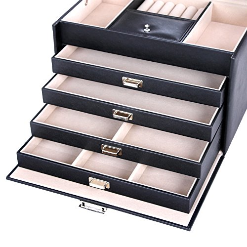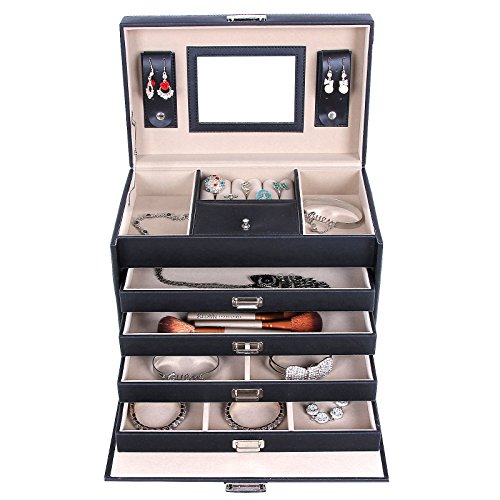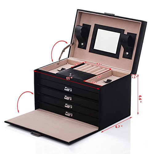 - MULTIPURPOSE JEWELRY BOX: 5 layers with 4 removable drawers, 1 mirror, 2 belts for earrings, 1 ring case, and 10 more compartments in different sizes for necklaces, bracelets, cuff links, chains, brooches and makeup
