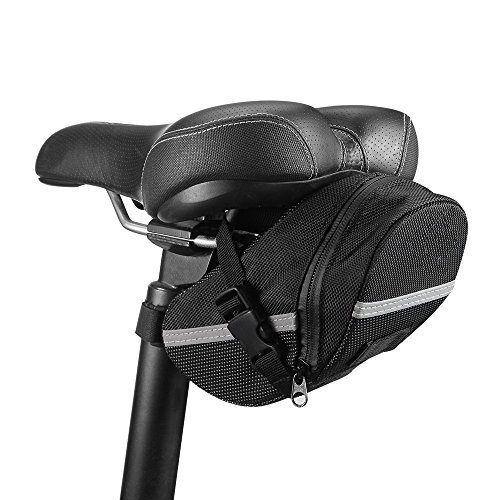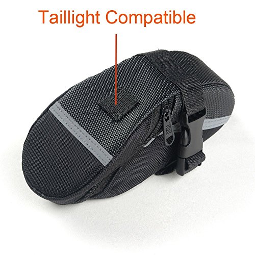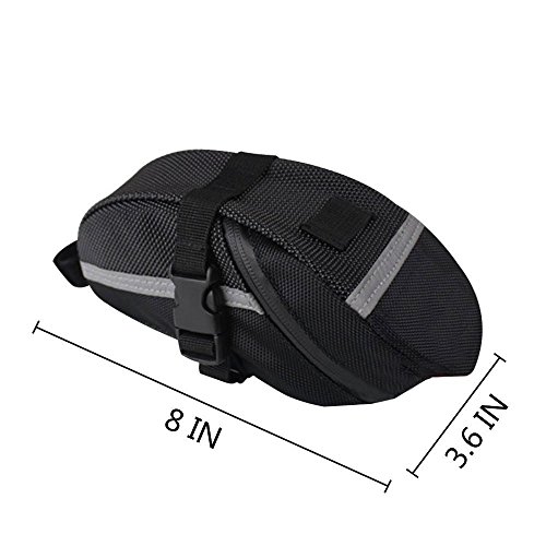 Compact and Capacious Bike Tail Pouch: it has a large room to hold an item as long as 8". Width 2.1"(front)-3.4"(back).The saddle bag can fit items such as multi-tool kit, smartphone, keys
