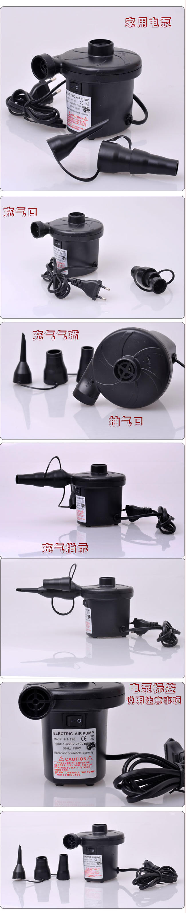 配件:说明书、气泵、三个充气头(可根据充气孔大小任意选择)、一个家用插头。