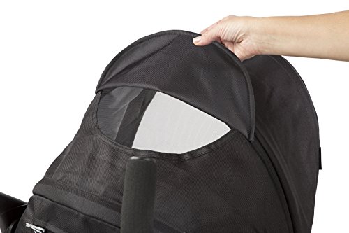 Oversized, 1 hand adjustable canopy with peek-a-boo window and zip out extension to block 99.9 percent of uva and uvb rays