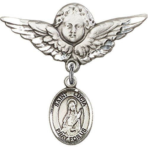 -. Title : Sterling Silver Baby Badge with St. Lucia of Syracuse Charm and Angel w/Wings Badge Pin 1 1/8 X 1 1/8 inches