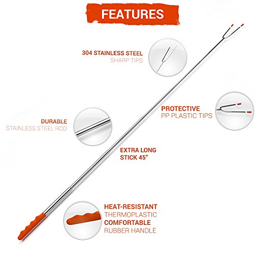 - SAFE FOR CHILDREN: 45" Extra Long Extendable Telescoping forks keep you and kids at a safe distance from any patio fire pit, backyard fire pit, bonfire pit, or campfire. The prongs’ sharp tips are protected with rubber, making them perfect for handling around children and making them a must have for any BBQ.