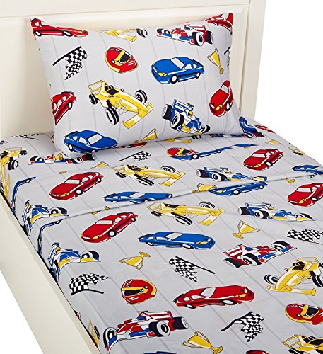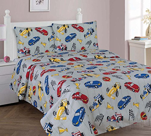MB Collections Gray Race Car 4 Piece Printed Sheets with Pillowcases for Kids / Teens # Full Si...